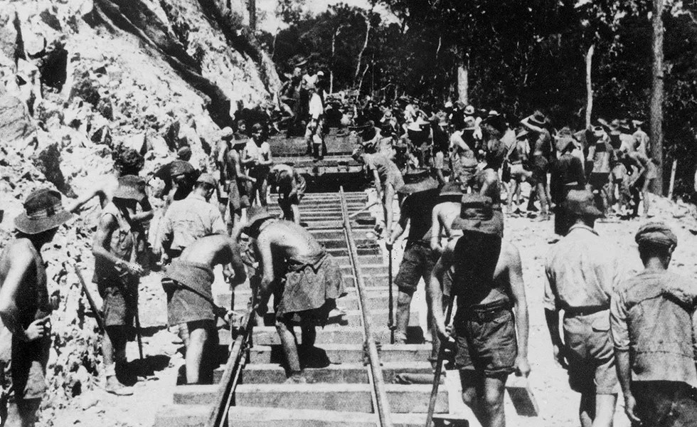 To facilitate easy transport of troops and materiel towards their ever-moving front line, the Japanese were building the Siam-Burma Railway, and the captured POWs were a handy source of manual labour. Crammed into unventilated boxcars and shuttled to Kanburi, Thailand where the railway line began, the POWs were made to work for sixteen to eighteen hours a day with crude tools and below subsistence-level food; the Japanese rationale was that if one POW died, it could always be replaced with another. It was a natural thought process for them, since they looked upon surrender as a worse dishonour than death, and that by doing so the POWs had forfeited all rights to be treated as human beings.
